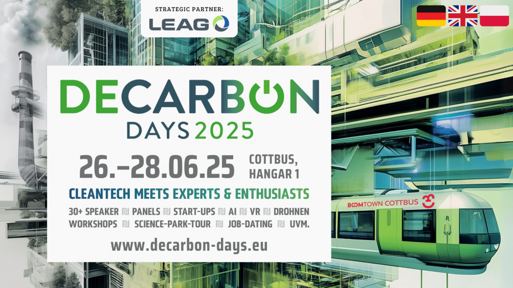 Wie werden saubere Technologien die Zukunft unserer Wirtschaft prägen? Und wie kann mit ihnen aus innovativen Regionen heraus neue Innovationskraft und Wettbewerbsfähigkeit entstehen? Diesen Fragen widmen sich die Decarbon Days vom 26. bis 28. Juni 2025 in Cottbus.
