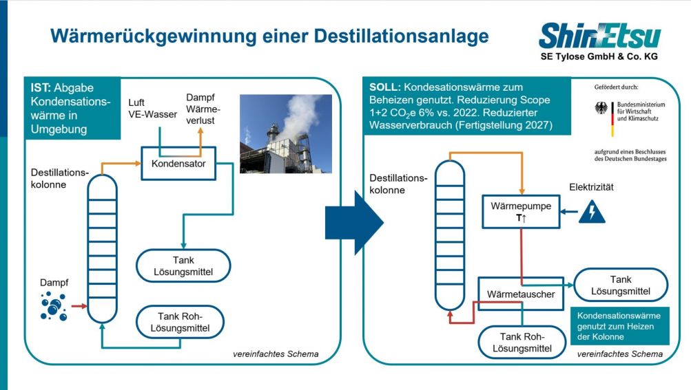 Bei der Effizienzmaßnahme in diesem Projekt handelt es sich um die Erneuerung einer Destillationskolonne mit Wärmerückgewinnung. Es wird in eine neue Destillationskolonne mit Wärmerückgewinnung via Brüdenverdichtung investiert. Der mechanische Verdichter erhitzt die Brüden auf ein Temperaturniveau, das zum Beheizen der Destillationskolonne verwendet werden kann. Die Brüden geben die Wärme im Wärmetauscher an das Roh-Lösungsmittel ab und kondensieren dabei. Unter Berücksichtigung des Mehrverbrauchs an Strom werden mit der Maßnahmenumsetzung jährlich ca. 6.400 t CO2-Emissionen vermieden.